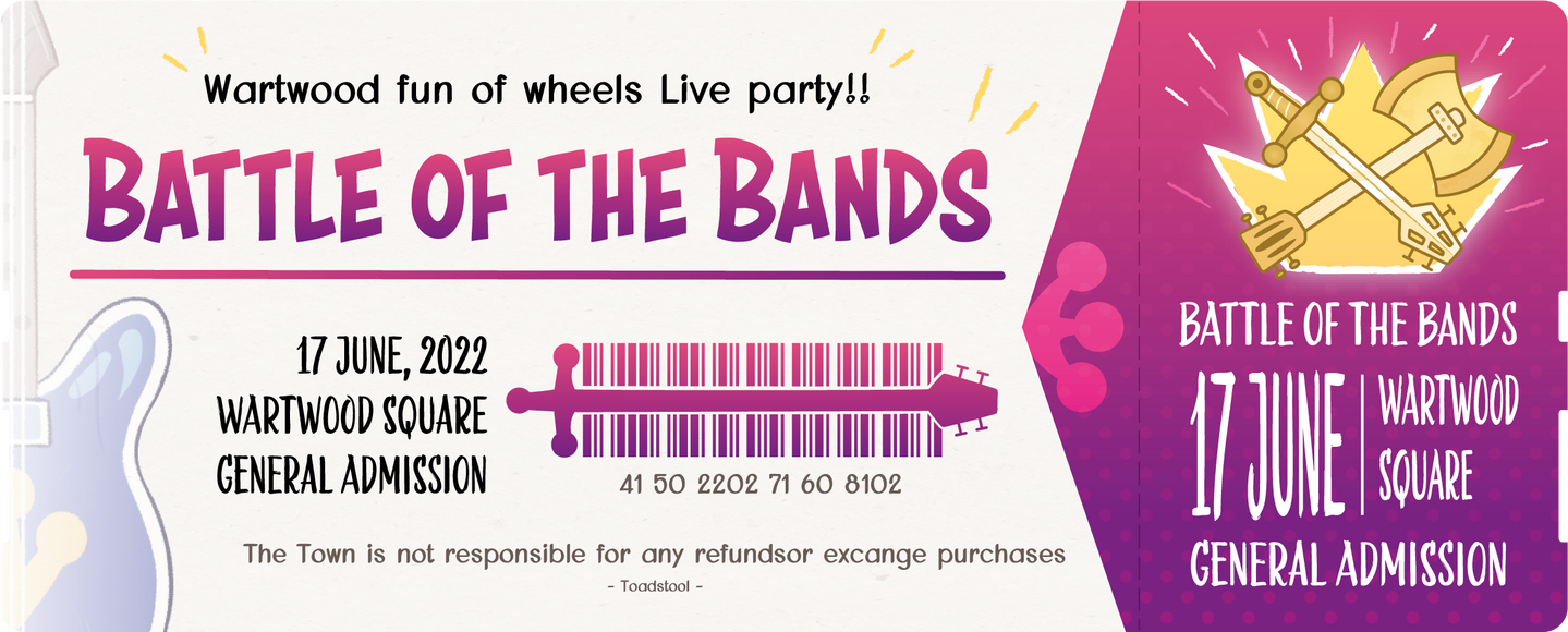 Sasha Waybright crashes Wartwood! To welcome her and bring together the spooked towners, Mayor Toadstool is holding a talent show. This is an entrance ticket to Battle of the Bands.